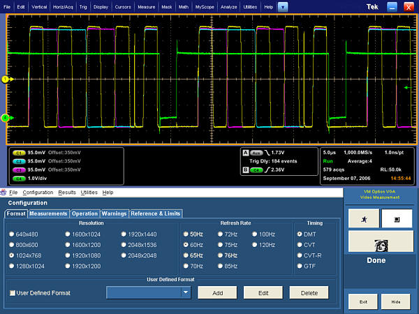 Option VGA supports pervasive analog RGBHV signal formats typically communicated through VGA, DVI-I, or DVI-A interfaces. Automated measurement is possible for 10 standard signal resolutions spanning from 640×480p (VGA) through 2048×2048p (QXGA), at selected vertical refresh frequencies from 60 to 120 Hz. A user-defined format configuration utility enables users to easily create, edit, or recall custom modes and seamlessly access the full test automation of the VM6000 instrument.