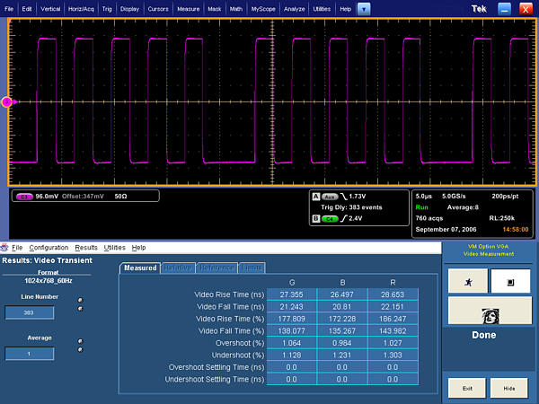 Approximately 150 video measurements can be performed for each supported mode, delivering a comprehensive assessment of RGB video fidelity, HV Sync quality, and format conformance. Parameters and test methods are based on industry standard (VESA) test procedures, enabling easy comparison against the requirements of the Video Signal Standard (VSIS) and applicable DMT, GTF, or CVT timing standards. Convenient averaging and configuration controls deliver the flexibility to perform either speedy or precise measurements in accordance with VESA sampling requirements. A full suite of comprehensive RGBHV video parameters can be measured in less than 5 minutes. Preloaded signal reference data and tolerance limit files simplify results analysis, eliminating laborious spreadsheet entry and computation. Test results, and even waveform screen captures can be quickly documented with reports that can be automatically generated, printed, and saved.