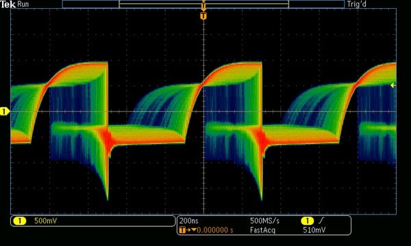 Die Digital-Phosphor-Technologie mit FastAcq ermöglicht eine Signalerfassungsrate von über 280.000 Kurven/s sowie Farbintensitätsabstufung in Echtzeit.