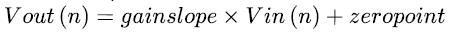 The gain slope can either be obtained by using a spreadsheet to calculate the linear regression of the points, or graphically by hand. To obtain the gain slope graphically, carefully plot each measurement point on a rectangular coordinate system, the X axis is the DC source voltage and the Y axis is the measured DC output value. Using a straight edge, draw a line through the points, minimizing the error between the line and each point. The gain slope is taken by the slope of the drawn line (rise in Y divided by run in X), and the zero point error taken at the point at which the line crosses the Y axis. The DC output value can be predicted by the following equation: