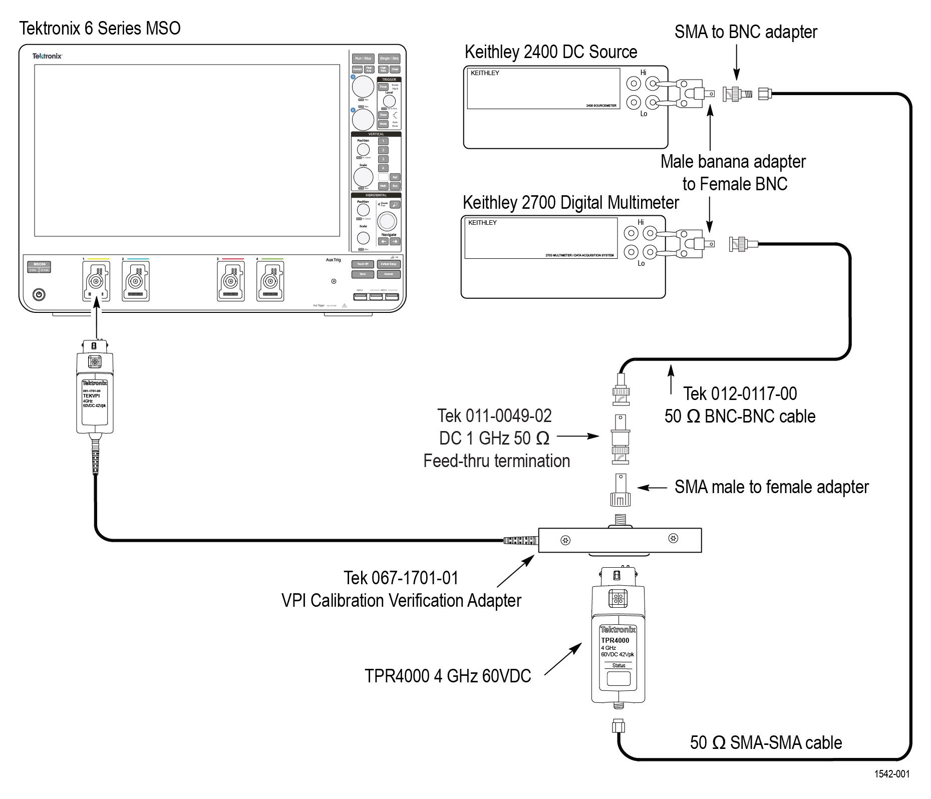 - Connect the TekVPI Calibration/Verification adapter to the oscilloscope.