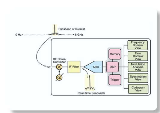 Figure 3 depicts the RTSA architecture. An integrated down-converter positions the real-time bandwidth on any passband up to the analyzer’s upper limit. After filtering, the down-converted signal goes through an ADC that digitizes it, allowing triggering, capturing and analysis of the signal all at once.