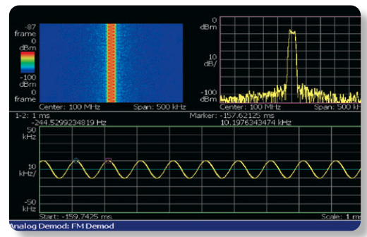 - A multi-domain view allowing simultaneous display of any three modes: spectrogram, power vs. time, frequency domain or demodulation data (AM, FM, PM)