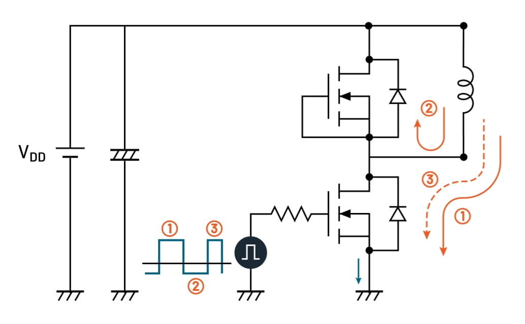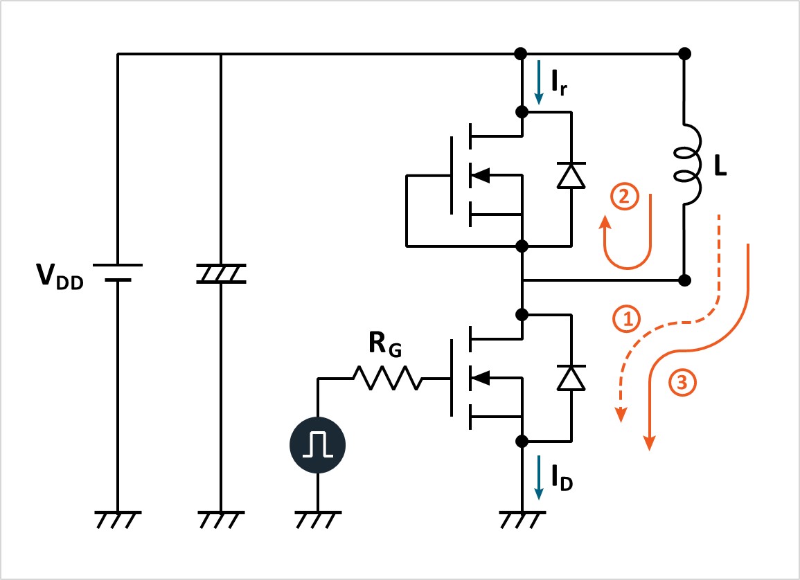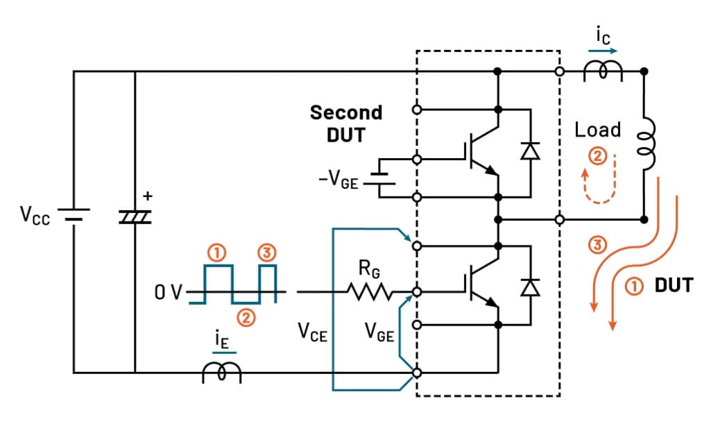 Figure 5 shows the current flow within the different stages of the test for a DPT with MOSFETs. The same current flow would apply when testing IGBTs as shown in Figure 6.