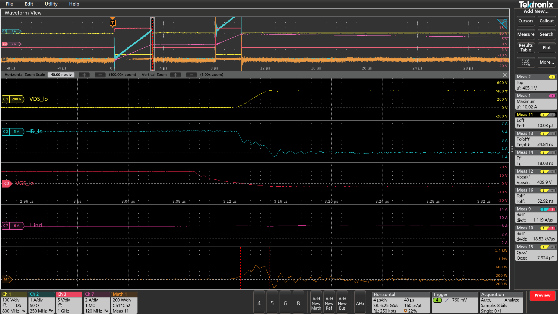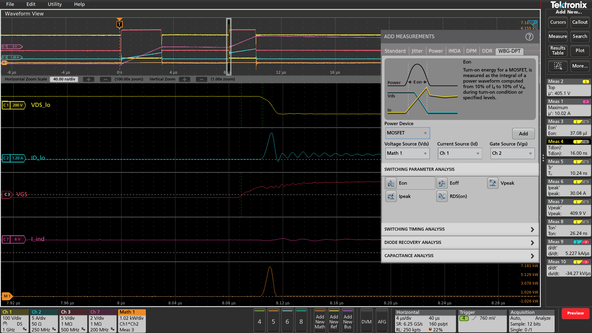 Similarly, energy losses during switching can be determined using channel math to multiply voltage and current to generate a power waveform, and using an area measurement (integration) to determine energy. To simplify this, the WBG-DPT app provides Eon and Eoff measurements under the Switching Parameter Analysis group. This measurement performs the necessary math and quickly displays the result.