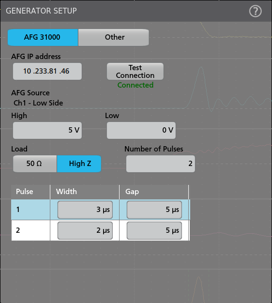 - AFG31000 Series Arbitrary/Function Generators offer a Double Pulse Test Application on the unit to quickly generate pulses with varying pulse widths. The next section gives a description of this feature. The AFG31000 Series is available with dual outputs and can serve as general-purpose function generators, independent of an oscilloscope. In this application note the AFG 31000 is controlled from its front panel, however the AFG31000 can also be connected via LAN and controlled from within the WBG-DPT Double Pulse Testing application software on the 4, 5 or 6 Series MSOs. The configuration menu for contolling a LANconnected AFG is shown in Figure 15.