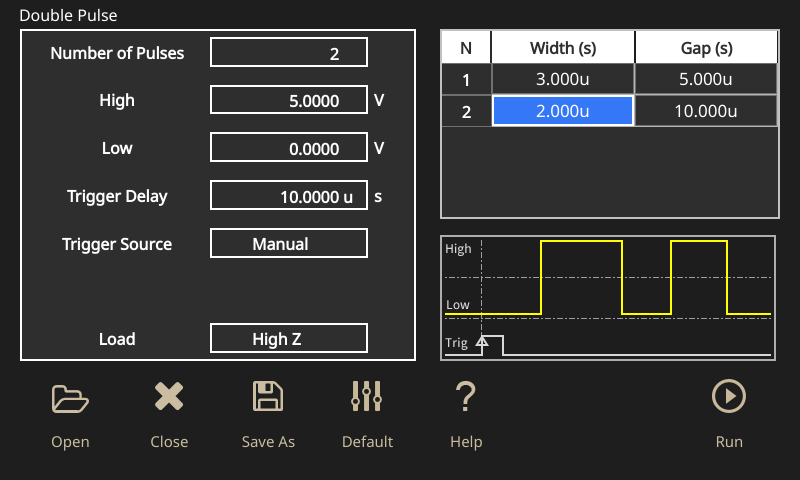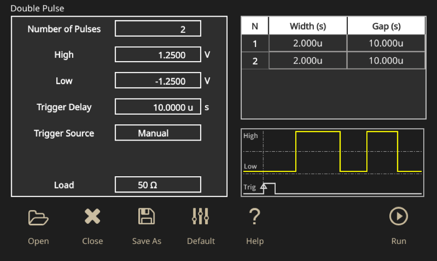 The double pulse stimulus was set on the AFG31000 as shown in the screen capture in Figure 22.