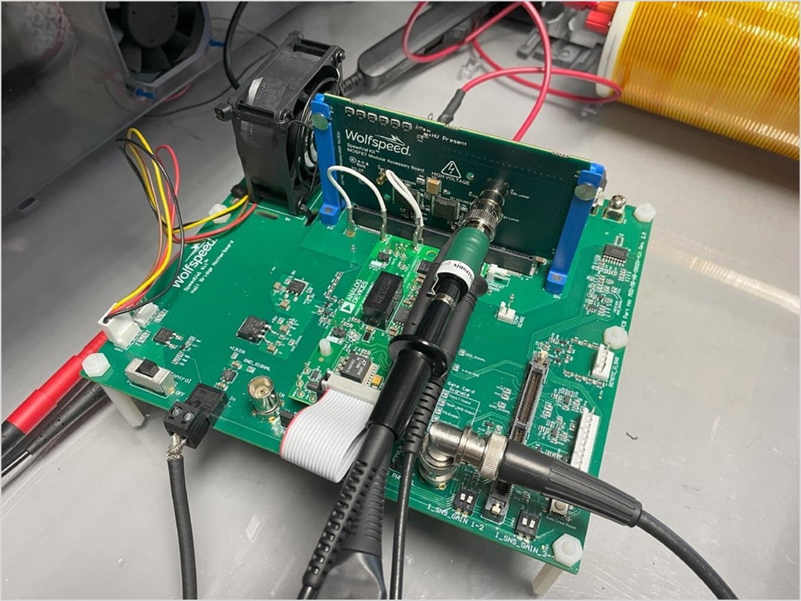 For this case study, measurements are taken on a Wolfspeed SpeedVal Kit™ Half-Bridge Motherboard with SpeedVal Kit TOLL Power Daughter Card [13]. The daughter card includes two 650 V SiC MOSFETs in a half-bridge configuration. The setup uses 1 mH air core load, and the source of the low-side FET is tied to earth ground through a shunt resistor. The test setup is shown, configured for lowside switching measurements, in Figure 21.