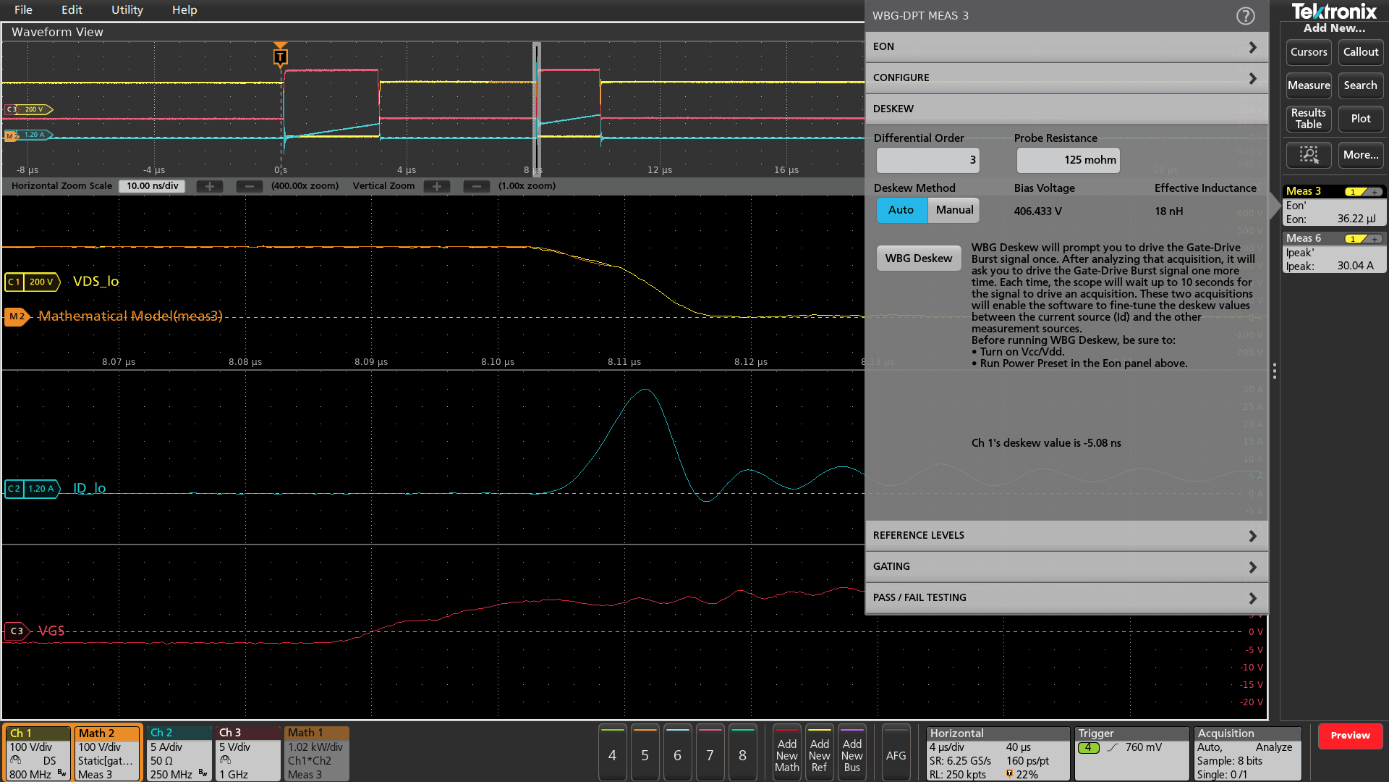 The math for these calculations can be performed on the oscilloscope by combining waveform math to multiply the VDS and ID waveforms to build a power waveform and then using an area (integration) measurement to find energy, gated to measure during turn-on and turn-off. The calculations can also be performed on waveform data by using math software such as MATLAB. In this app note, calculations will be performed using measurement algorithms built into the WBG-DPT oscilloscope application.