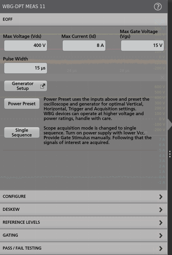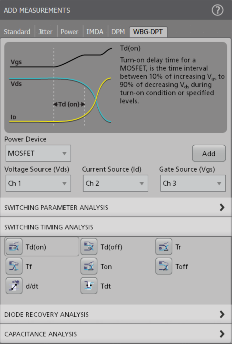 As with all measurements on the 4, 5 and 6 Series MSOs, the WBG-DPT application controls are accessed through the Measure button in the upper right corner of the touchscreen. For this example, the Power Device type was set to MOSFET. The VDS, ID, and VGS sources were set to Channels 1, 2 and 3 as shown in Figure 25.