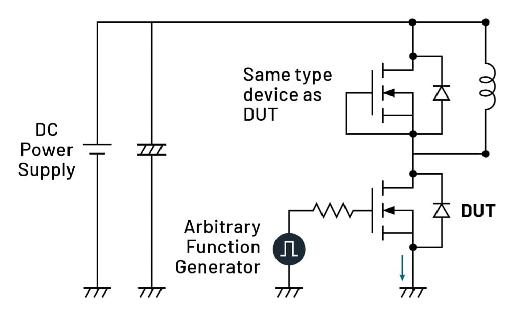 The test is most often performed with an inductive load and a power supply, although the exact circuit may vary depending on the intended application of the power devices under test. [3] The inductor is used to replicate circuit conditions in a converter design. The power supply is used to provide voltage to the inductor. An arbitrary/function generator is used to generate pulses to trigger the gate of the MOSFET to turn it on and off.