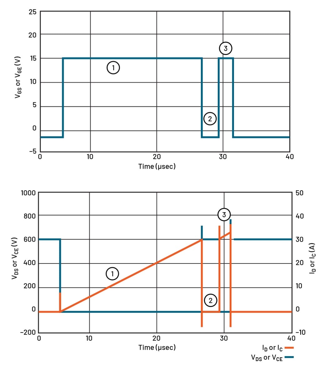 Figure 7 shows typical double pulse test waveforms for a low-side MOSFET or IGBT. There are three important stages of a typical DPT. These stages are represented in Figures 5, 6 and 7 and described here: