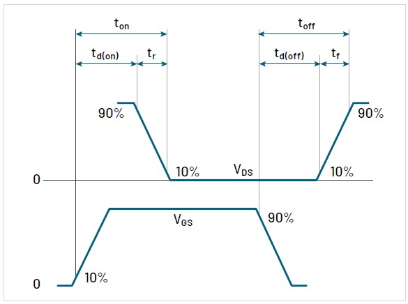 - td(off): Time interval between VGS at 90% of its peak and VDS at 10% of its peak amplitude.