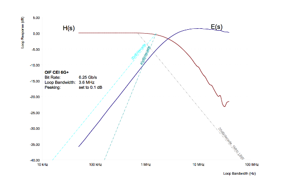 The lower graph shows the loop’s error response the jitter that is not tracked. In the lower frequency region (a), as long as the applied jitter magnitude at a given frequency is sufficiently tracked by the loop response, then no serious eye closure will occur. At high frequency, there is essentially no jitter tracking (b). The position of the knee in either curve relative to the other is obviously critical. So is the slope of the error curve, and any peaking that may be present (c).
