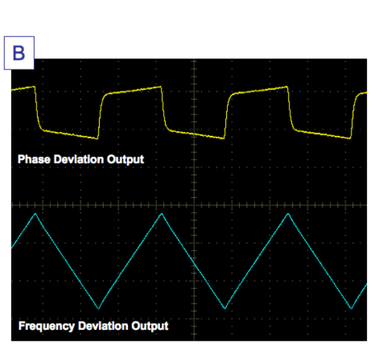 In this example, a signal with SSC was measured with a clock recovery instrument (A). Outputs on the rear panel of the instrument provide monitoring points to view the loop behavior. When viewed on a low bandwidth, real time oscilloscope, the traces in B were obtained. The triangular waveform characteristic of the common form of SSC is clearly visible in the lower trace. The yellow waveform displays the difference in phase between data input and clock recovery output; shown is the response to a ramp in frequency, first positive then negative, as expected from a second order Type 2 PLL setting.