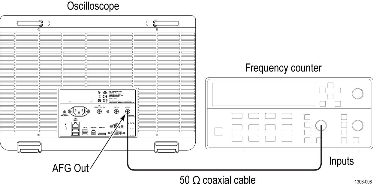 - Connect a 50 Ω cable from the AFG Out connector to the frequency counter input as shown in the following figure.