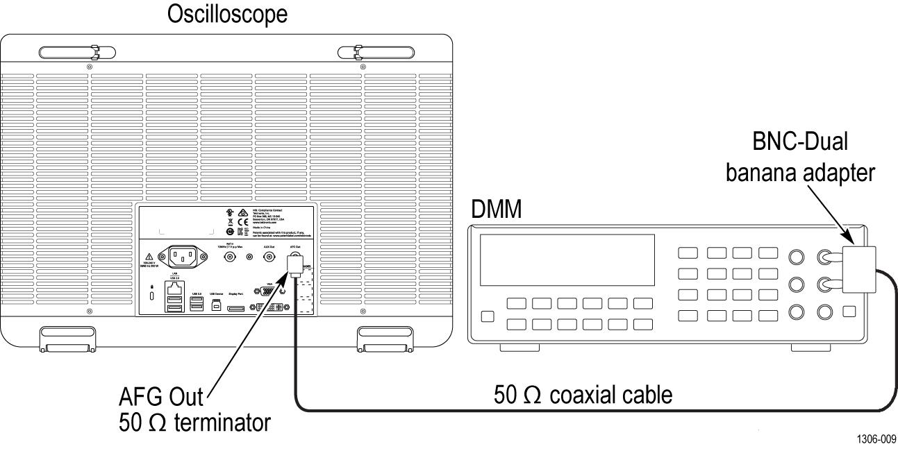 - Connect the arbitrary function generator output to the DMM as shown in the following figure. Be sure to connect the 50 Ω terminator to the AFG Out connector.