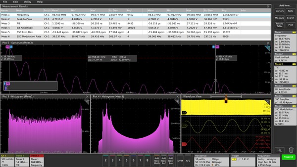 たとえば、拡散スペクトラム・クロック信号の解析では、平均クロック周波数と最大周波数偏差が表示されます。この場合、周波数の変動、つまり低周波ジッタが十分に抑えられていなければなりません。問題はその周波数が実際に、設計どおりに変動しているかどうかです。拡張ジッタ解析アプリケーションを使用すれば、周波数およびTIE測定のタイム・トレンドをクロック波形と合わせてプロットできます。さらに、測定のヒストグラムとスペクトラムもプロットできるため、複数の領域での回路の動作を詳細に解析できます。