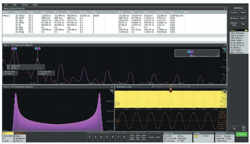 図1に示すすべての解析は、5シリーズMSOの標準機能で行われています。タイミング変動の詳細な解析は、オプションの拡張ジッタ/タイミング測定機能で行うことができます。