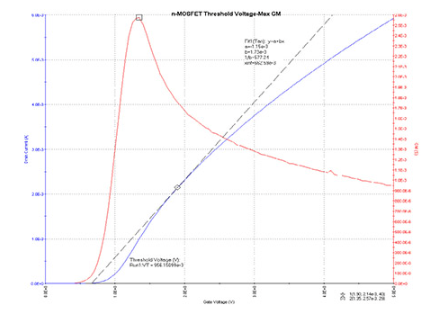 ゲート電荷試験中、ゲート電圧は増加し、トランジスタをオンにする。平坦領域の間、電流が特定のコンプライアンスレベルに達するため、ドレインSMU(SMU2)は、電圧制御から電流制御モードに切り替わる。ソフトウェアは、オフ状態からオン状態への遷移の間、ドレイン電流過渡現象およびドレイン電圧の結果を返す。