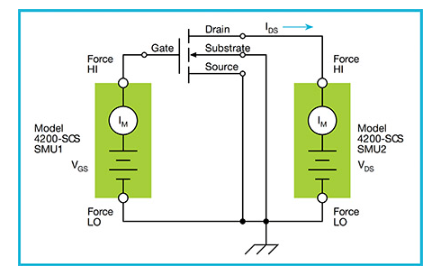 4200A-SCSの2つのSMUを使用してパワーMOSFETのゲート電荷を測定する。図3にゲート電荷測定の基本回路図を示す。SMU1のフォースHI端子をMOSFETのゲート端子に接続し、ゲート電流(Ig)を印加し、ゲート-ソース電圧(Vgs)を時間の関数として測定する。SMU2は、特定の電流コンプライアンス(Ids)を設定し一定の電圧(Vds)をドレインに印加する。4200-SMUの最大コンプライアンス電流は0.1Aで、4210-SMUの最大コンプライアンスは1Aである。