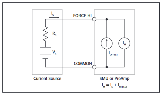 The ideal ammeter should read zero current when its input terminals are left open. Practical ammeters, however, do have some small current that flows when the input is open. This current, which is known as the input offset current, is generated by bias currents of active devices and by leakage currents through insulators within the instrument. The offset current generated within the SMU is included in the Model 4200-SCS's specifications. As shown in Figure 1, the input offset current adds to the measured current so the meter measures the sum of the two currents: