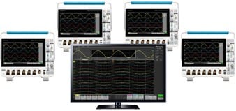 Pan, zoom, rearrange and make measurements on signals acquired on four or more oscilloscopes.