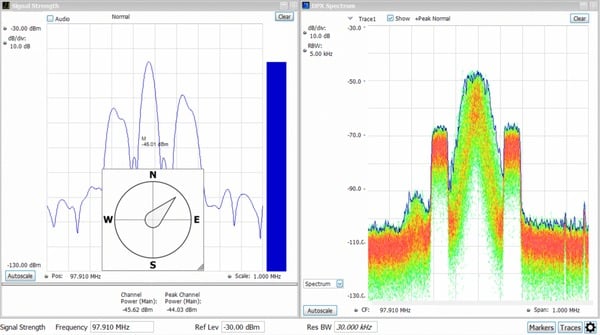 標準 SignalVu-PC 軟體讓方向尋找和訊號強度量測變得快速輕鬆。在下圖中,指南針可以使用提供的 Alaris 智慧型天線持續監控天線方向,而訊號強度監控則負責執行量測及提供訊號強度的音訊指示。搭配 SignalVu-PC 的 MAP 選項後,系統能自動將訊號強度和方位放置在您選擇的地圖上。