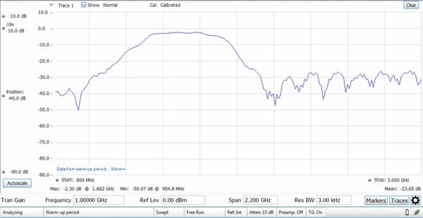 追蹤產生器 (RSA500 的選項 04) 可透過 SignalVu-PC 控制。下圖顯示從 800 MHz 到 3 GHz 的帶通濾波器響應。選項 SV60 新增回波損耗、纜線損耗和斷點距離。