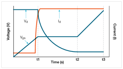 Figure 3 shows typical gate and drain waveforms as a function of time. As current is forced to the gate, Vgs increases until it reaches the threshold voltage. At this point, the drain current (Id) begins to flow. When Cgs is charged up at time t1, Id stays constant and the drain voltage (Vd) decreases. Vgs remains constant until it reaches the end of the plateau. Once Cgd is charged at time t2, the gatesource voltage (Vgs) starts to increase again until it reaches the specified maximum gate voltage (VgsMax).