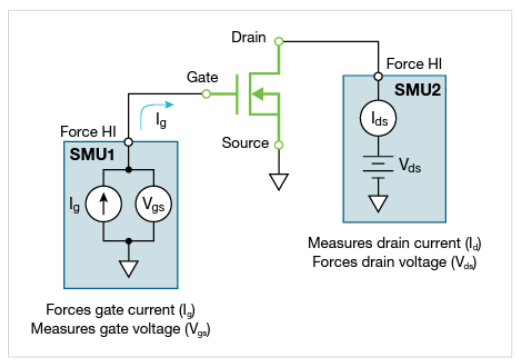 The magnitude of the current forced to the gate by the gateSMU, is the gateCurrent (Ig) parameter. The drain voltage (Vds) is the bias voltage applied to the drain and drainLimitI is the compliance current (Ids) of the drain SMU.