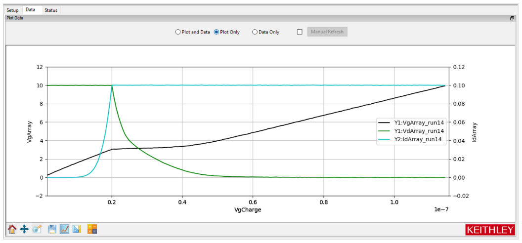 The Keithley Automated Characterization Suite (ACS) software supports making gate charge measurements on MOSFETs using two source measure unit (SMU) instruments and the gateCharge.py Python Test Module (PTM) that is included with the software. This test is one of many included in the extensive test libraries provided in the ACS Software Suite.