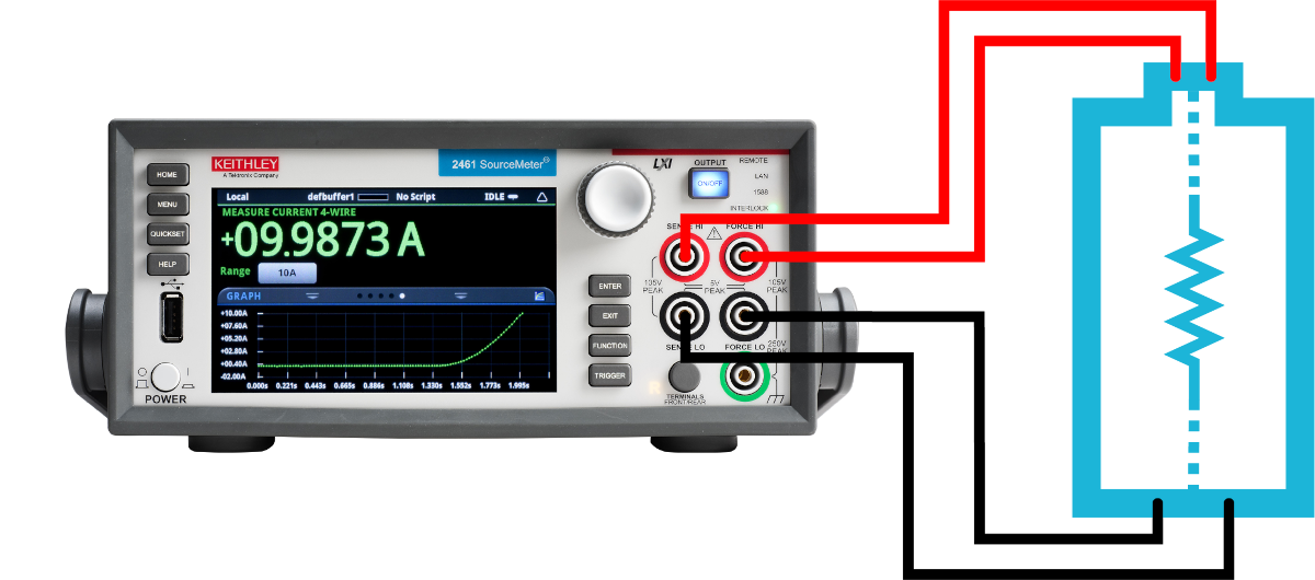 The currents used in the DCIR method are typically much larger than the ACIR method, making this a more realistic test in terms of use case as batteries are often exposed to sudden high current draw. The internal resistance of the battery is the biggest restrictor of a battery’s ability to output large current, so it’s important to identify a battery that cannot perform under high current situations. An instrument that is capable of outputting high current pulses while making synchronized voltage measurements is ideal. Source Measure Units (SMUs) such as the Keithley 2461 are capable of accurately delivering 10 A pulses, while measuring the resulting voltage with 6.5 digit resolution. These SMUs are powered by Test Script Processor (TSP®) enabling users to run a full DCIR pulse sequence and receive calculated data from the front panel using the DCIR TSP App.
