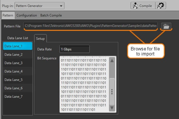 - Import Text Files: Import multiple streams of predefined bit patterns simultaneously with a Text file import. Edit and modify these patterns in the pattern generator plugin after importing.