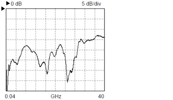 In the following plots, the Linear sweep is from 0.04 to 40 GHz (4 GHz/div), the AC connector is input (port 1), and the AC+DC connector is output (port 2).