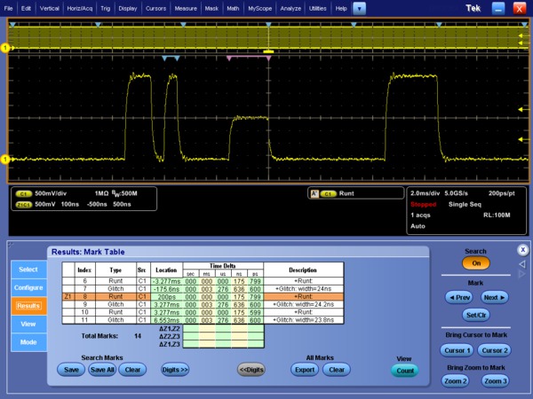 Suchen – Ergebnisse einer erweiterten Suche für einen Runt-Impuls oder einen schmalen Glitch innerhalb einer großen Signalaufzeichnung. Jede Runt- oder Glitch-Instanz wird automatisch markiert.