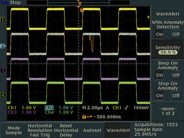 WaveAlert zur Erkennung von Signalanomalien macht Sie auf jedes Signal aufmerksam, das vom „normalen“ Verlauf abweicht, z. B. Glitch auf Kanal 2.