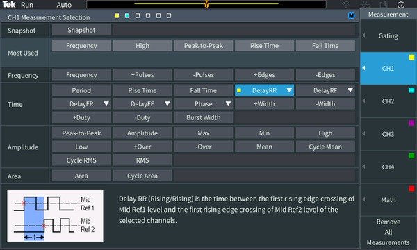 Ein Auswahlbildschirm für Einzelmessungen erleichtert die Auswahl aus 32 automatischen Messungen, ohne dass Sie durch mehrere Menüs navigieren müssen. Sie können aus Ihren am häufigsten durchgeführten Messungen auswählen, die oben auf der Seite angezeigt werden, oder aus vier Kategorien auswählen: Frequenz, Zeit, Amplitude und Fläche. Das HelpEverywhere-System enthält Tipps zu jeder Messung, erleichtert so die Auswahl, welche Messung zu verwenden ist, und liefert Hinweise zur Interpretation der Ergebnisse.