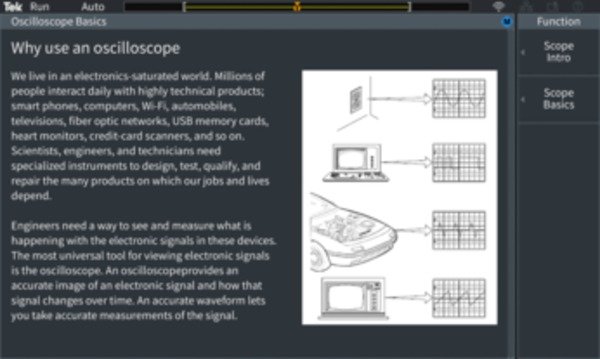 „Oszilloskope – Einführung“ ist ein in das TBS2000 integriertes kurzes Handbuch. Bei Betätigung der Taste „Funktion“ an der Frontplatte gelangen Sie zu Informationen über grundlegende Oszilloskopfunktionen. Außerdem erhalten Sie eine Übersicht über das TBS2000 und das Verwaltungssystem TekSmartLab für Laborversuche zu Ausbildungszwecken.