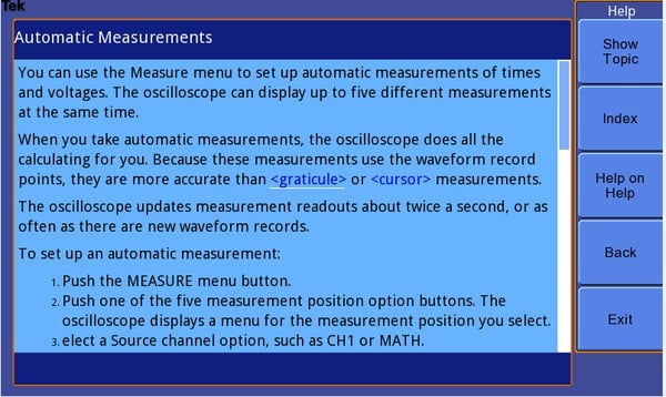 Das integrierte Hilfemenü enthält wichtige Informationen zu den Merkmalen und Funktionen des Oszilloskops. Die Hilfe-Sprache entspricht der jeweiligen Benutzeroberfläche.