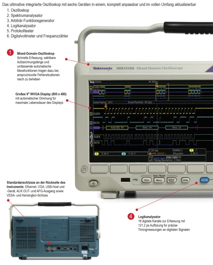 Die integrierten Schaltungen von heute erfordern ein Oszilloskop mit einem ebenso hohen Integrationsgrad. Das Mixed-Domain-Oszilloskop (MDO) der Baureihe MDO3000 erfüllt diese Anforderung. Es ist das ultimative Oszilloskop mit sechs Geräten in einem: Spektrumanalysator, Arbiträrfunktionsgenerator, Logikanalysator, Protokollanalysator und Digitalvoltmeter/Zähler. Das MDO3000 ist vollständig anpassbar und in vollem Umfang aktualisierbar. Fügen Sie die Geräte und Leistungsmerkmale hinzu, die Sie jetzt oder zu einem späteren Zeitpunkt benötigen.