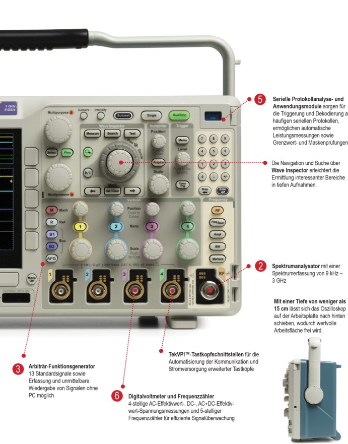 Im Bedarfsfall müssen die richtigen Messgeräte sofort zur Verfügung stehen. Das MDO3000 enthält sechs Geräte in einem und lässt sich dank seines geringen Gewichts von 4,2 kg mühelos transportieren. Damit stellt es die perfekte Wahl dar, wenn es um geringen Platzbedarf und Vielseitigkeit geht.