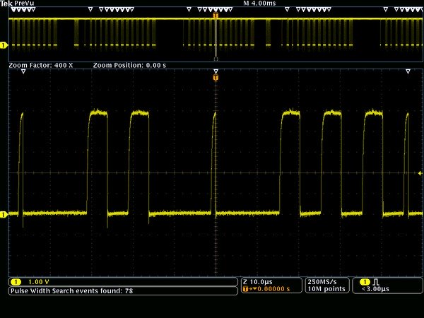 Das Erkennen eines Gerätefehlers ist nur der erste Schritt. Zur Ursachenermittlung muss anschließend das Ereignis erfasst werden. Hierfür enthält das MDO4000C über 125 Trigger-Kombinationen, die einen kompletten Satz von Triggern bieten – einschließlich Runt-, Logik-, Impulsbreiten-/Glitch-Trigger, Trigger auf Setup/Hold-Verletzung, serielle Pakete und parallele Daten – sodass Sie das Ereignis schnell finden können. Und bei einer Aufzeichnungslänge von 20 Mio. Punkten lassen sich viele Ereignisse, sogar tausende serielle Paketen, in einem einzigen Vorgang zur weiteren Analyse erfassen, wobei gleichzeitig die zur vergrößerten Darstellung von speziellen Signaldetails erforderliche hohe Auflösung beibehalten wird und verlässliche Messwerte aufgezeichnet werden.