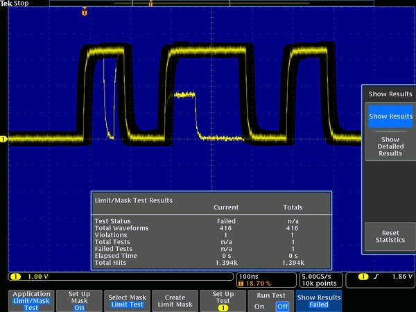Eine gängige Aufgabe während des Entwicklungsprozesses ist die Charakterisierung des Verhaltens eines bestimmten Signals in einem System. Eine Methode, der so genannte Grenzwerttest, besteht darin, ein geprüftes Signal mit einer guten oder „idealen“ Version des Signals unter Verwendung von benutzerdefinierten horizontalen und vertikalen Toleranzen zu vergleichen. Eine andere gängige Methode ist die Maskenprüfung, bei der ein geprüftes Signal mit einer Maske verglichen wird, um zu ermitteln, wo das zu prüfende Signal von der Maske abweicht. Die Baureihe MDO4000C bietet sowohl Grenzwert- als auch Maskentests, die beide für die langfristige Signalüberwachung, die Charakterisierung von Signalen während der Schaltungsentwicklung oder die Prüfung im Produktionsbereich geeignet sind. Für Konformitätstests wird ein breite Palette von Telekommunikations- und Computerstandards bereitgestellt. Darüber hinaus können benutzerdefinierte Masken erstellt und für die Signalcharakterisierung verwendet werden. Sie können eine Prüfung nach Ihren speziellen Anforderungen erstellen, indem Sie die Prüfdauer durch eine Anzahl von Signalen oder eine Zeitangabe definieren, einen Verletzungsgrenzwert festlegen, der erreicht werden muss, bevor die Prüfung als nicht bestanden gilt. Außerdem können Sie Treffer zählen und zusammen mit statistischen Daten sammeln, und Aktionen festlegen, die bei Verletzungen, Prüfungsfehlern und abgeschlossener Prüfung durchgeführt werden sollen. Gleichgültig, ob Sie eine Maske mit einem bekannten guten Signal oder mit einer benutzerdefinierten Maske oder einer Standardmaske festlegen: Die Durchführung von Pass-Fail-Prüfungen bei der Suche nach Signalanomalien, wie z. B. Glitches, war noch nie so einfach. Die optionale Grenzwert/Maske-Funktion ist während eine Testzeitraums von 30 Tagen kostenlos nutzbar. Dieser automatische Testzeitraum beginnt automatisch ersten Einschalten des Gerätes.