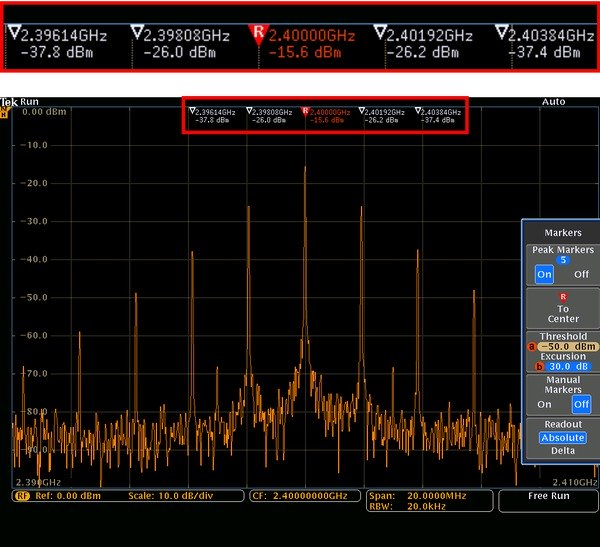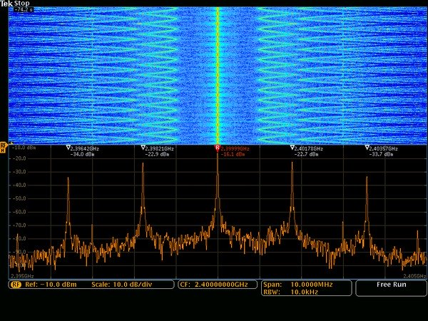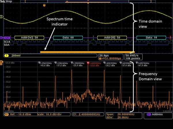 Gleichgültig, ob es sich um Bluetooth, 802.11 WiFi, ZigBee oder eine andere Drahtlos-Technologie handelt, mit dem MDO4000C machen Sie zeitlich synchronisiert das gesamte System sichtbar, den Analog-, Digital- und HF-Teil, sodass Sie sich ein wirkliches Bild vom Systemverhalten machen können. Sie können mit einer einzigen Erfassung eine sehr große Bandbreite darstellen, sodass Sie sich einen Einblick in die Wechselwirkungen zwischen mehreren Drahtlos-Technologien verschaffen können. Oder Sie zeigen einen ganzen Breitbandfrequenzbereich einer aktuellen Norm wie z. B. 802.11/ad an.