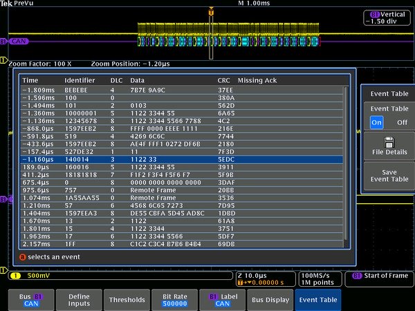 Mit der Taste Suchen lassen sich große Erfassungsmengen automatisch nach benutzerdefinierten Ereignissen durchsuchen. Alle Vorkommen des Ereignisses werden durch Suchmarkierungen hervorgehoben und können mithilfe der Tasten Zurück (←) und Weiter (→) auf dem Bedienfeld angesteuert werden. Zu den Suchtypen gehören Flanke, Impulsbreite/Glitch, Timeout, Runt, Logik, Setup/Hold, Anstiegszeit/Abfallzeit, Parallelbus und Paketinhalte bei I2C, SPI, RS-232/422/485/UART, USB 2.0, Ethernet, CAN, CAN FD, LIN, FlexRay, MIL-STD-1553, ARINC-429 und I2S/LJ/RJ/TDM. Eine Tabelle mit Suchmarkierungen bietet eine Tabellenansicht der Ereignisse, die bei der automatischen Suche gefunden wurden. Jedes Ereignis wird mit einer Zeitmarke angezeigt und erleichtert dadurch die Messung von Zeitunterschieden zwischen den Nachrichten.