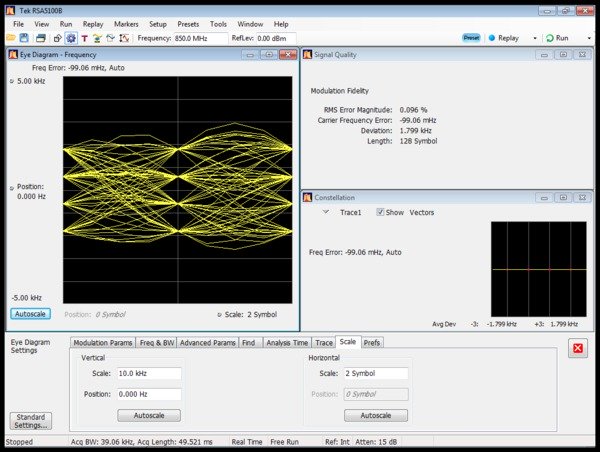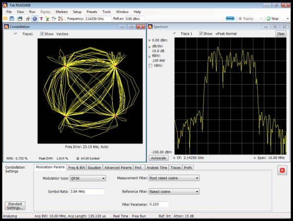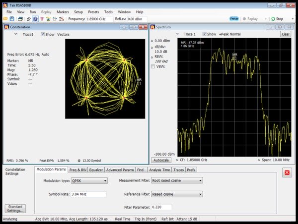 Die Abbildung der Konstellation kann durch den Benutzer geändert werden. As Digitalfilter stehen Raised-Cosine-Filter, Root-Raised-Cosine-Filter, Gaußsche Filter, Rechteckfilter, lineare Filter, KTR-Filter und benutzerdefinierte FIR-Filter zur Auswahl.