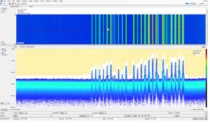Die Wiedergabe aufgezeichneter Signale kann stundenlanges Beobachten in Echtzeit und Warten auf eine Spektralverletzung auf wenige Minuten verkürzen. Die Aufzeichnungslänge wird nur durch die Größe des Speichermediums begrenzt. Die Aufzeichnung ist eine Grundfunktion von SignalVu-PC. Die SignalVu-PC-Anwendung SV56 (Wiedergabe) ermöglicht die vollständige Analyse aller SignalVu-PC-Messungen (auch das DPX-Spektrogramm). Die Angaben für die Mindestsignaldauer werden auch während der Wiedergabe eingehalten. AM-/FM-Audiodemodulation ist möglich. Es stehen variable Spans, Auflösungsbandbreiten, Analysedauern und Bandbreiten zur Verfügung. Für aufgezeichnete Signale können Frequenzmaskentests bis zu einem Span von 40MHz ausgeführt werden und bei Maskenverletzungen werden bestimmte Aktionen ausgeführt (z. B. Signalton, Anhalten, Speichern eines Trace, eines Bilds und Speichern von Daten). Teile der Wiedergabe lassen sich auswählen und zur wiederholten Untersuchung der Signale in einer Endlosschleife wiedergeben. Die Wiedergabe kann ohne Überspringen erfolgen, oder es können Zeitlücken zur Verkürzung der Prüfdauer eingefügt werden. Die Wiedergabe in Live-Geschwindigkeit gewährleistet die Güte der AM/FM-Demodulation und bietet eine 1:1-Wiedergabe der tatsächlichen Zeit. Die Marker im Spektrogramm zeigen die Uhrzeit der Aufzeichnung, sodass eine Korrelation zu Ereignissen in der realen Welt hergestellt werden kann. In der nachfolgenden Abbildung ist das FM-Band gezeigt, wobei eine Maske zur Erkennung von Spektralverletzungen dient. Gleichzeitig wird das FM-Signal bei einer Mittenfrequenz von 92,3 MHz wiedergegeben.