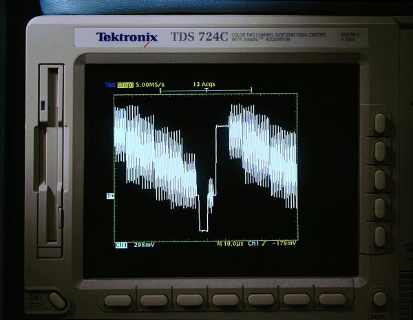 The same composite video signal, captured with a digital phosphor oscilloscope, shows all the details of this complex waveform in real time.