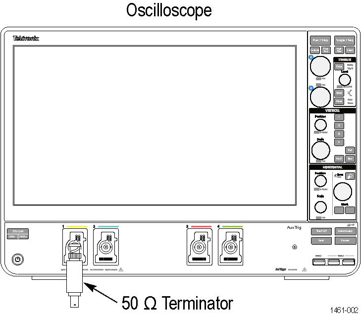 - Use a 50 Ω cable to connect the AUX Out signal from the rear of the instrument to the channel 1 input of the same instrument, as shown in the following illustration.